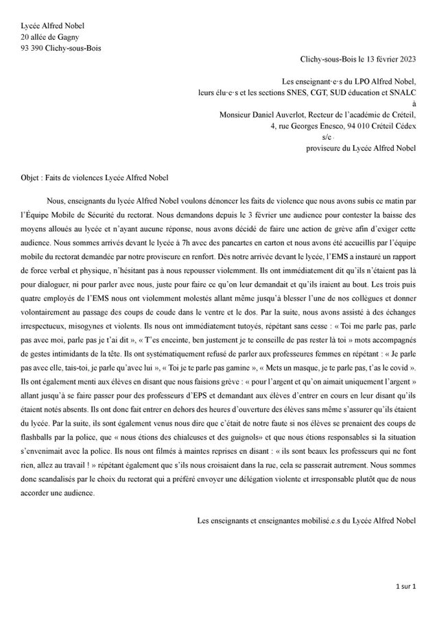 Au lycée Alfred Nobel, dans le 93, l’Éducation nationale pratique le « dialogue social » en envoyant des gros bras intimider et bousculer des grévistes qui demandent des moyens pour leur lycée.