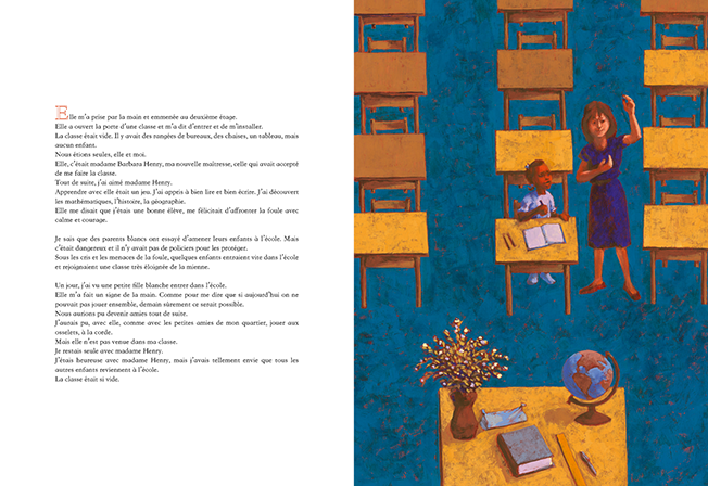 Le lendemain, la maîtresse raconte l’histoire vraie de Ruby Bridges, la petite fille noire de 6 ans du tableau ; elle est peinte sur le chemin de l’école escortée par 4 policiers.