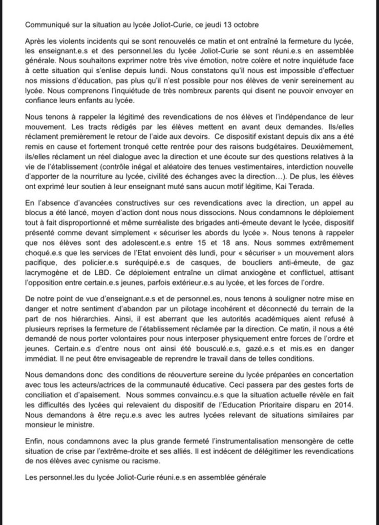 En lutte La situation au lycée Joliot Curie au 13 octobre 14 octobre 2022 Questions de classe(s) Communiqué sur la situation au lycée Joliot Curie, ce jeudi 13 octobrePartagezÉpinglePartagez
