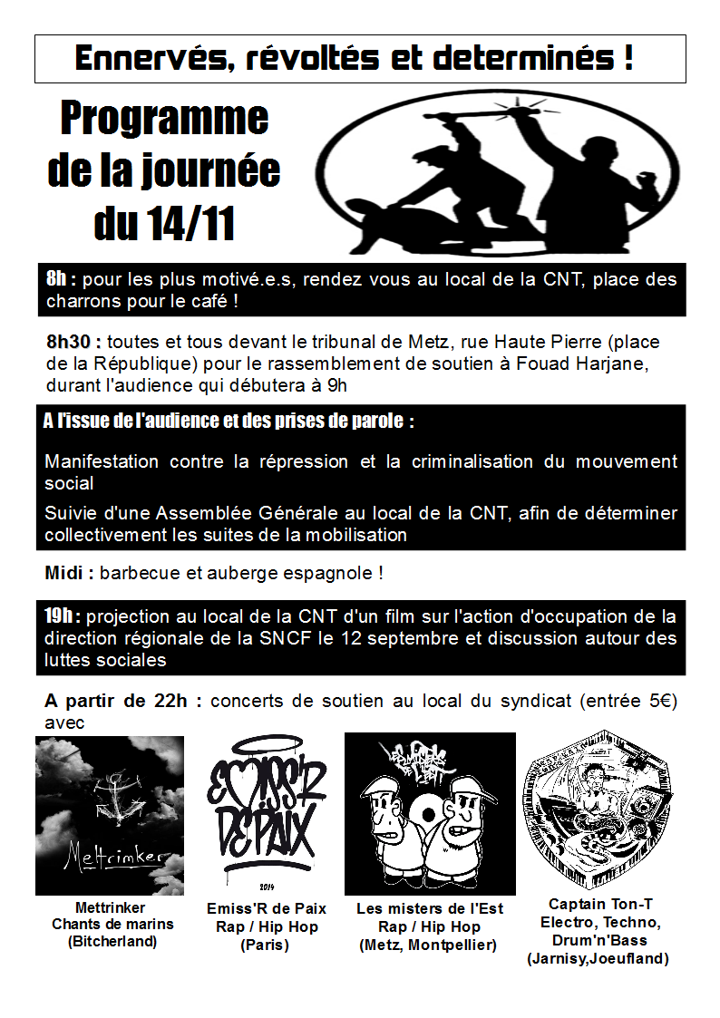A l’heure ou de nombreuses luttes se profilent dans l’éducation comme ailleurs, et à l’occasion de l’audience de notre camarade Fouad Harjane, la CNT appelle à la la grève l’ensemble des travailleur.se.s de l’éducation et invite toutes et tous, organisations, collègues et étudiant.e.s à venir se rassembler massivement devant le tribunal de grande instance de metz, vendredi 14 novembre à 9h.
