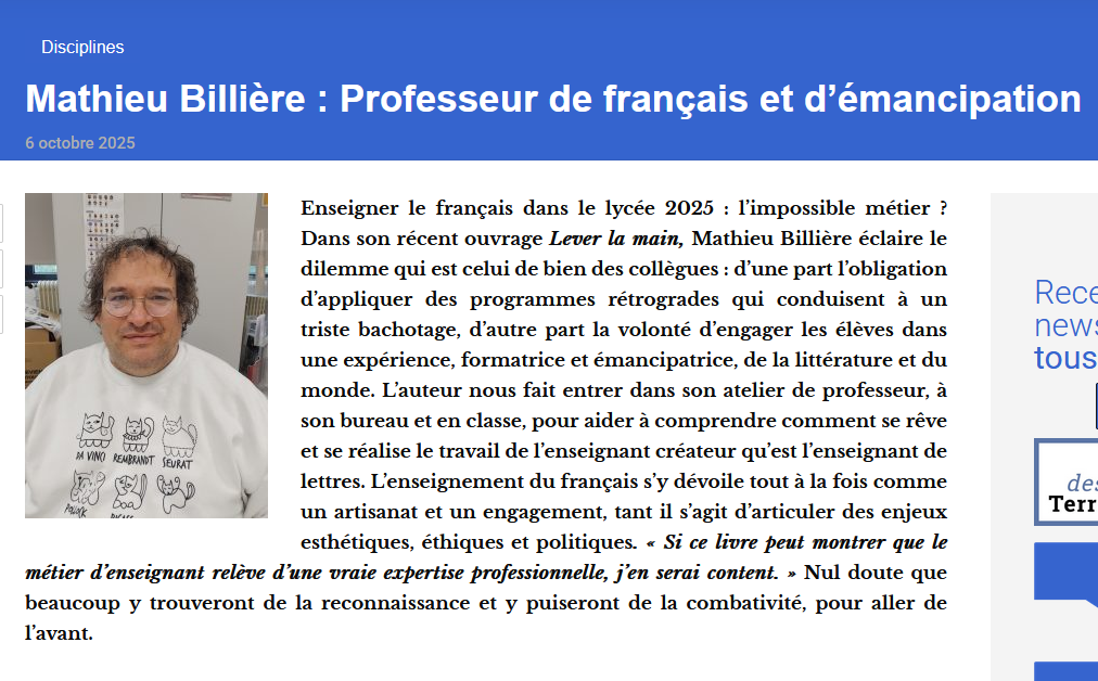Le dernier livre de la collection N’Autre Ecole chez Libertalia a fait l’objet d’un entretien entre l’auteur et Jean-Michel Le Baut dans le Café Pédagogique. Où il est question entre autres d’autobiographie didactique, de la littérature comme acte de résistance et de commentaire en équipe. A lire