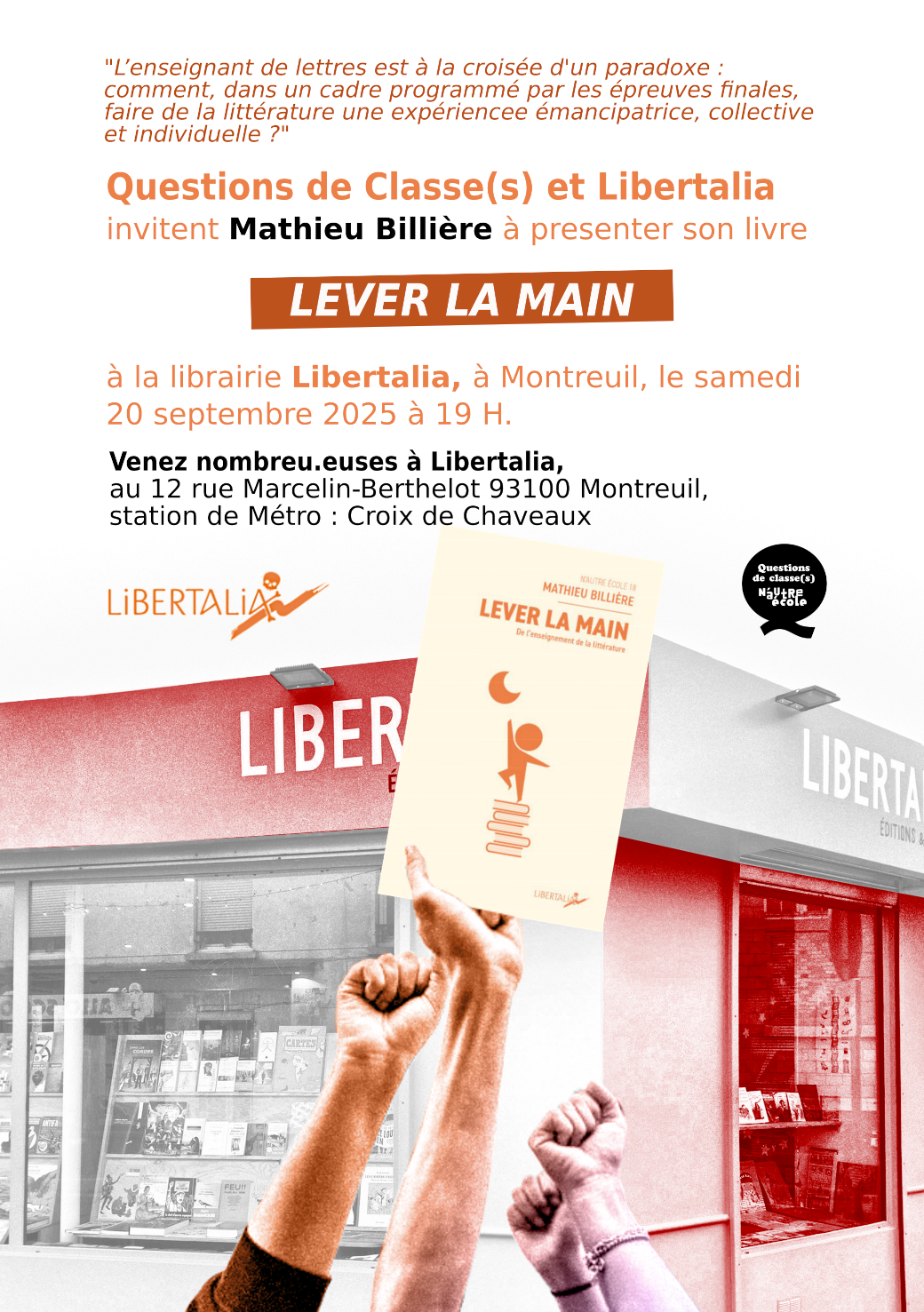 Billet de Une Rencontre avec Mathieu Billière samedi 20 septembre ) à 19 h – Librairie Libertalia, Montreuil 17 septembre 2025 Questions de classe(s) Le collectif Questions de classe(s) vous invite à une soirée autour du nouveau titre de sa colelction PartagezÉpinglePartagez
